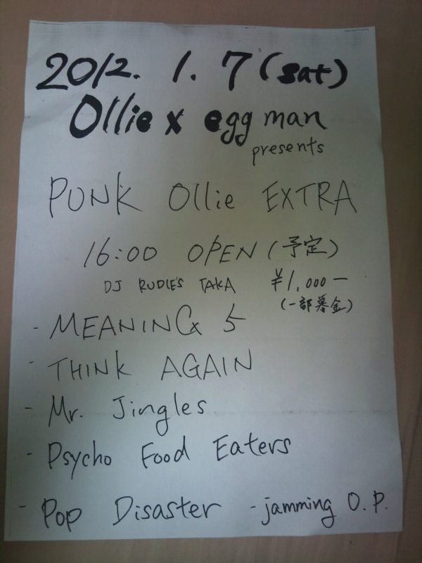どうも僕です。つってね ってかこれで年内最後のブログとなるのでしょうね。 が… ライブもやってなければ特に伝える事もないのですが、来年はたくさんと報告ができる年となると思います。 【年明け1発目(つまり姫始め)】 LIVE ACT :POP DISASTER/THINK AGAIN/jammingO.P./PSYCHO FOOD EATERS/Mr.JiNGLES/and more… / DJ:TAKA(RUDIE’S)/YUMA(eggman) / OPEN 16:00 START 16:30 年明けそうそうに[PUNK Ollie EXTRA]と題し、東日本大震災復興チャリティイ チケット代金は格安の¥1000(1D込)となっております。 チケット購入方法は、ollie-charity@eggman.jpに[氏名/枚数]をメールするだけ!(予約での受付となります) 義援金 2012年になってもこういった行動を続けて行こうという気持ちを持っての開催です。 思い切りエッグマンのページからコピペ丸出しですがやる気満々ですよ。 とにかく年明けタフガイ宣言をモットーとしてるはやっさんとしてはこの日に懸ける勢いが半端じゃないです。 人のイベント、なんなら企業のイベントなのに勝手にフライヤー作っちゃうレベルだからね。 我ながら力作。 EXTREME CAMPのフライヤーもこの日書いちゃおうかしらね。 皆さん、1月14日は渋谷クラブクアトロでMINOR LEAGUEとのEXTREME CAMPですよ。 ちなみにちゃんと出演してくれるのは いつもライブハウスだとミーニングアーミーの天真爛漫なはしゃぎっぷりで一張羅のワンピースが汚れちゃうのが恐いとお嘆きのおレディー達、チャンスですよ。 あ、いや変な意味じゃなくてね。 ちなみにはやっさんのやる気はすごいですよ、この日も。 顔で言うとこれぐらい。 あ、近過ぎっ? ちょっと待ってね…引いてみるから。 アレをコレして、ほんでこうしたら… よし、これで大丈夫だろ… ポンッ!!! 間違えた…。 いろいろありがとよ