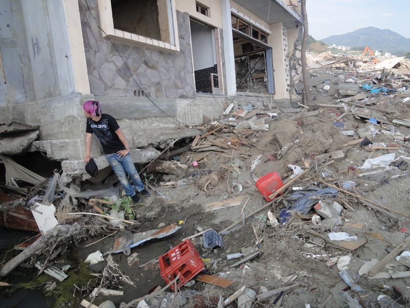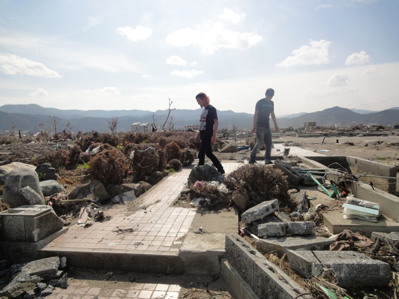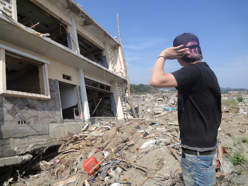 全部で16万ぐらい使ったんじゃないかなw 車に積むのに協力してくれたお店の方達も本当にありがとうございました。 ちなみにこの時点でハヤは朝の7時半起きが効いてて、都内すら出てないのにグロッキーでした。 その状態で助手席にはチン…。 結果…彼は一睡もせずに仙台あたりまでひたすら助手席で騒いでいました。 ■2日目(6月21日) なんだかんだで9時間ぐらいの運転で岩手にたどり着き、そこから山を越える事1時間半ぐらいで陸前高田市に到着しました。 そもそも今回陸前高田市に行こうと決めたのは、俺の元同僚のフジナミという子が陸前高田の出身という事が大きな要因でした。 現地についてから一番被害がひどかったと言われている現場(陸前高田市街地)に到着しました。 そこで車を停めてしばらく辺りを歩きました。 ここは元々家があって、おそらく玄関先だと思われる 元々の海の場所は俺のうしろの方に見える白い建物がある辺りだったそうです ここが全部市街地だったなんて信じられますか? ってか、やっぱ写真じゃ伝わんねーなぁ。 フジナミは前日に陸前高田入りをして俺らを待っててくれました。